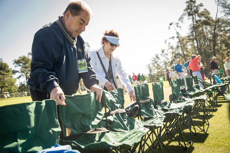 Tom and Sherry Toggweiler of Detroit place chairs near the 13th fairway prior to the second round of the 2016 Masters