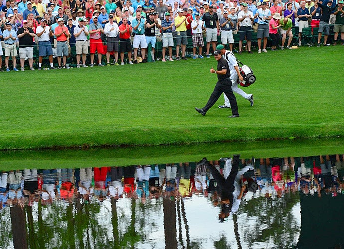 Spieth, Woods and Ben Crenshaw try to skip shots across a pond at Augusta National.