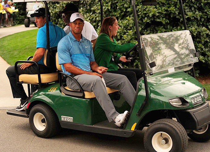 Woods is carted toward the practice area by a visibly excited volunteer.