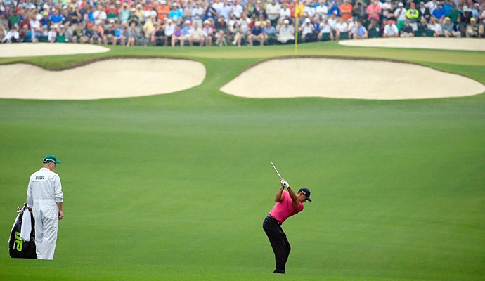 Woods hits an approach shot on the course during his practice round.