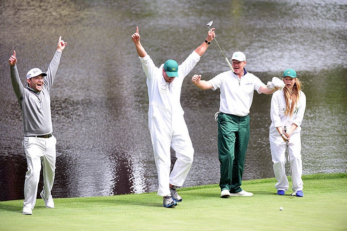Caddie Zacharia Rasego celebrates putting with Branden Grace of South Africa and Ernie Els of South Africa during the Par 3 Contest.