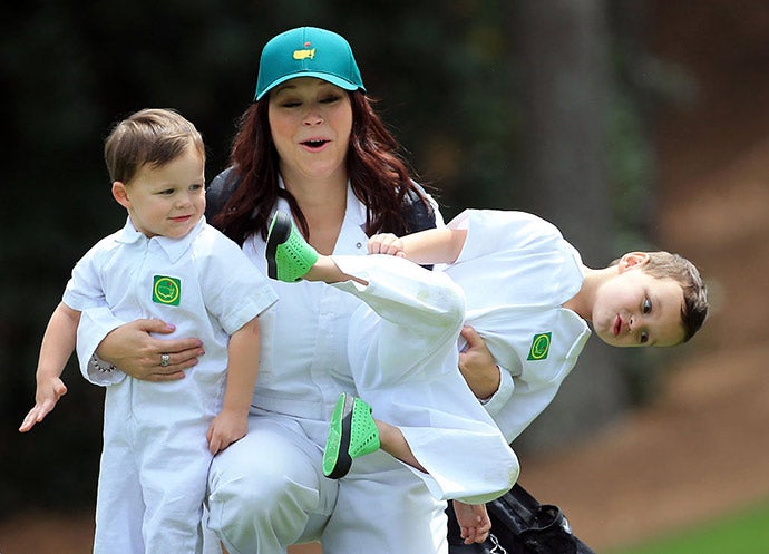 Wife of Marc Leishman of Australia, Audrey Hills and their sons Oliver and Harvey attend the Par 3 Contest.