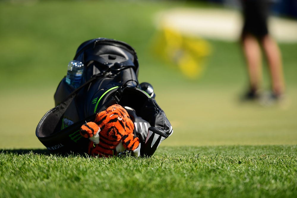 Woods's golf bag on the turf at the Farmers Insurance Open.
